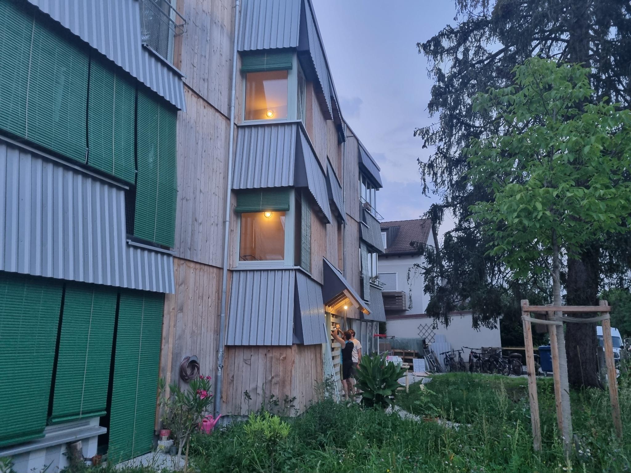 Unser Wohnprojekt Görzer 128 verfolgt das Ziel, bezahlbaren Wohnraum zu schaffen und dauerhaft zu sichern. Unser Haus-Vereinsname "Schwarmstimmung" spiegelt die kollektive Euphorie unserer bunt gemischten Truppe wider, mit der wir gemeinsame Ressourcen bündeln, um ein innovatives Wohnprojekt auf die Beine zu stellen. Wir setzen auf Selbstverwaltung, Schwarmintelligenz und Skillsharing. Wir möchten die Stadtgesellschaft auf planerischer sowie auf wohnpartizipativer Ebene bereichern. Es ist ein neues Modellprojekt für eine faire Wohnungspolitik in München entstanden, das auf Gemeineigentum basiert und damit sicher vor Spekulation ist. Im Frühling 2021 haben wir den Zuschlag für das Grundstück in der Görzer Straße 128 auf Erbpacht erhalten und im Juni 2022 den Erbpachtvertrag unterschrieben! Seit März 2023 halten wir die Baugenehmigung in Händen. Zusammen mit der Stadt München, dem Mietshäuser Syndikat und unseren Planer*innen ging es dann an die Realisierung unseres Wohnprojektes. Im Juli 2023 begannen die Bauarbeiten, im Dezember 2024 war es endlich soweit: wir sind eingezogen! Nun wird das Haus von 12 Erwachsenen und einem Kind bewohnt und belebt. Wir sind stolz und freuen uns auf die weitere Zeit! Die Solidargemeinschaft des Mietshäuser Syndikats hat und wird uns weiterhin in allen Phasen begleiten.